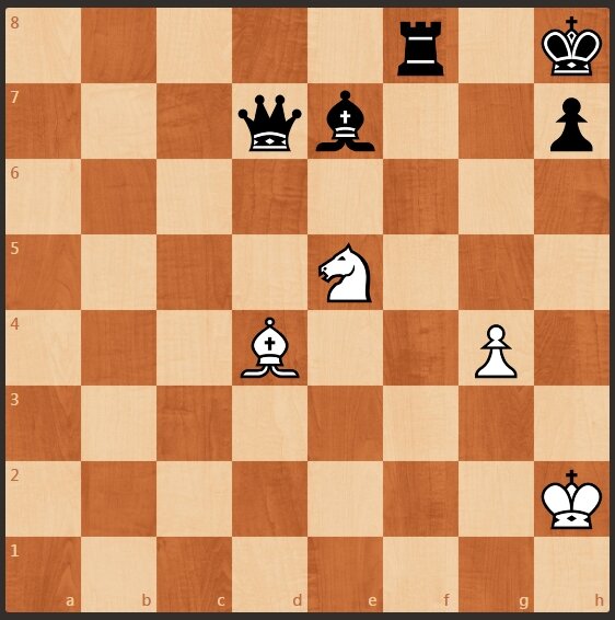 Предлагаю найти выигрыш в следующей позиции. У черных явный материальный перевес. Но белые могут пойти конем и дать вскрытый шах. Если белые сделают очевидный ход, заберут черного ферзя конем, то далее будет ничья. Однако белые начинают и выигрывают. Подписывайтесь на канал, будут новые интересные статьи. Решение идет далее. 1. Белые дат двойной шах ходом коня на f7. 1. ..................... черные отходят королем на g8. 2. Белые ставят коня на h6, мат. Следующая шахматная задача тут>>>