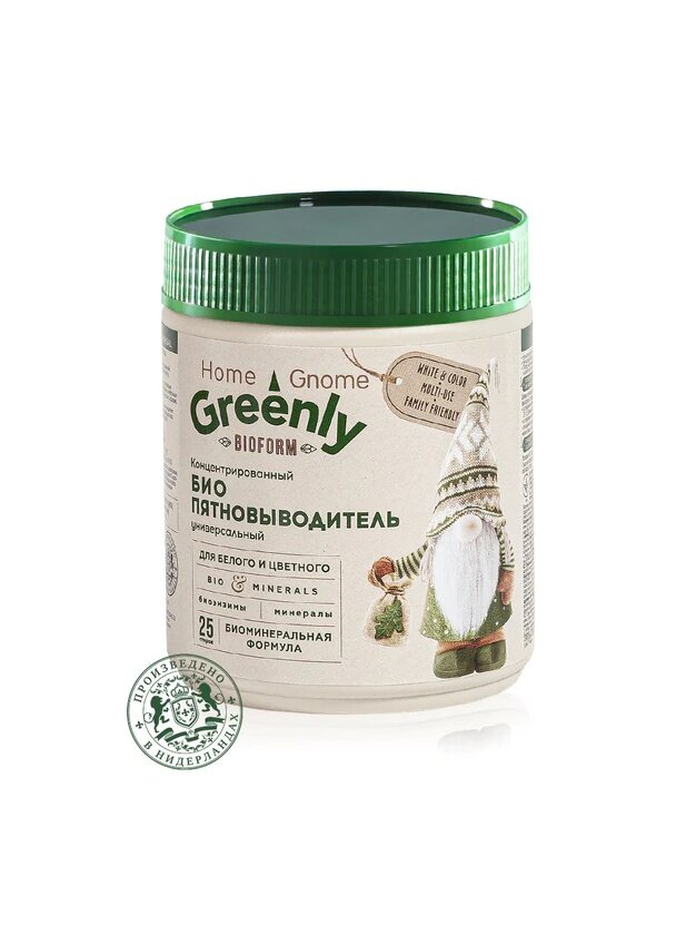 Биоминеральная формула для стирки в жёсткой воде! Концентрированный биопятновыводитель универсальный Home Gnome Greenly создан специально для эффективного применения в жёсткой воде. Особая биоминеральная формула пятновыводителя создана для легкого удаления сложных, застаревших пятен и неприятных запахов в воде любой жёсткости. Кислородный отбеливатель направленно работает против различных окрашенных загрязнений: чая, кофе, вина, фруктово-овощных соков, чернил, красок, а также убирает желтизну и серость. Эффективен против резких и неприятных запахов. Мультикомплекс биоэнзимов устраняет специфические виды трудновыводимых пятен – пищевые загрязнения: следы от кетчупа, майонеза и других соусов, каш, яиц, крови, мороженого, молочных и мясных продуктов, масла; способствует выведению белковых и смешанных загрязнений – физиологических, крови, пота, травы, косметики, обувных кремов. Носить вещи в химчистку больше нет никакой необходимости! Новый пятновыводитель позволит устранить даже заст