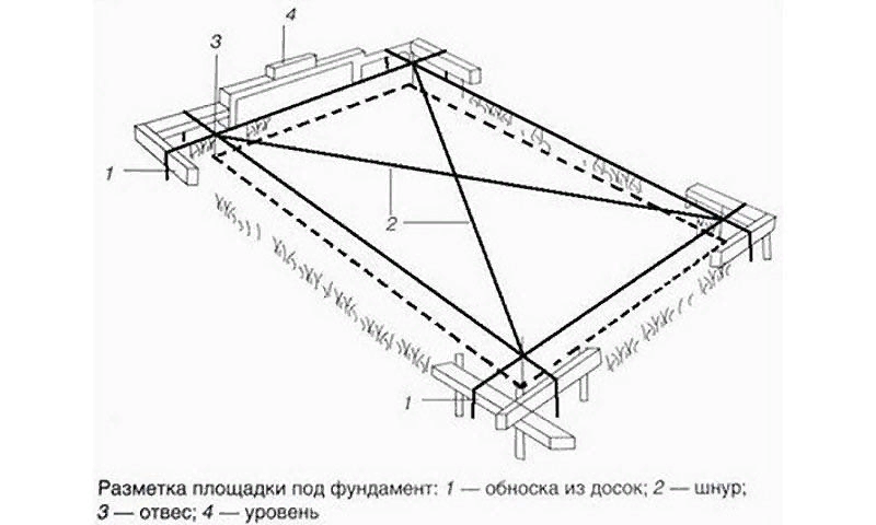От правильной разметки фундамента зависит качество будущего строительства. Чтобы здание не завалилось, необходимо соблюдать общие правила. Предлагаем познакомиться с информацией о том, какие инструменты понадобятся и в чем разница между различными видами фундамента. ВИДЫ РАЗМЕТОК ПОД ФУНДАМЕНТ Выделяют несколько видов фундамента. Каждый из них имеет свои особенности. Но общий принцип разметки соблюдается всегда. А именно: одну основную сторону будущего фундамента привязывают к какому-либо ориентиру, например, к забору. Существует три основных методики разметки: Секрет от мастера: какой бы метод вы не выбрали, для работы вам обязательно понадобятся калькулятор, прочная бечевка, режущие инструменты, колья. Опишем основные принципы разметки под различные виды фундамента. ПРЯМОУГОЛЬНЫЙ ФУНДАМЕНТ Лучше всего выполнить разметку способ «золотой треугольник». Вот что вам предстоит сделать: Секрет от мастера. Случается, что длина в 5 метров не выходит. Не пугайтесь. Отрегулируйте расстояние, пе