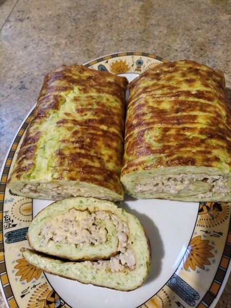 В сезон кабачков приготовим рулет из кабачков с мясным фарш. Сочный кабачок в сочетании с мясным фаршем создает неповторимую вкусовую гамму. Время приготовления 40 минут. Рулет запекается в духовке. Ингредиенты: Приготовление Сразу сделаем заготовку для начинки. Фарш обжариваем на сковороде до готовности. Подсолнечное масло не добавляем. Отставляем фарш в сторону для охлаждения. Переходим к приготовлению теста Кабачки натираем на крупной терке. Солим, перемешиваем, отставляем на пять минут пока пустят сок. В отдельную миску разбиваем яйца. Соль, перец кладем по вкусу. Перемешиваем вилкой до однородной массы. Отжимаем кабачки, чтобы вышел сок, помещаем в миску с яйцами. Перемешиваем, чтобы масса стала равномерной. Кладем измельченный чеснок, муку. Вымешиваем тесто. Выпекание Нагреваем духовку до 200 градусов. На противень стелим пергамент. Размешаем тесто равномерно по поверхности противня. Селиконизированный пергамент смазывать маслом не надо. Выпекаем тесто 25 минут. Время выпекания з