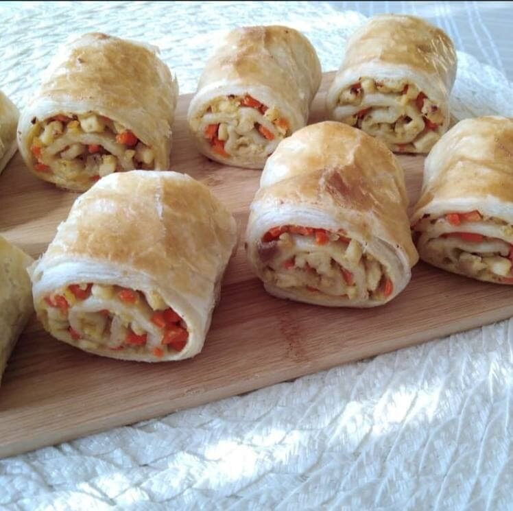 5️⃣Выложить рулетики на противень, смазать взбитым яйцом.