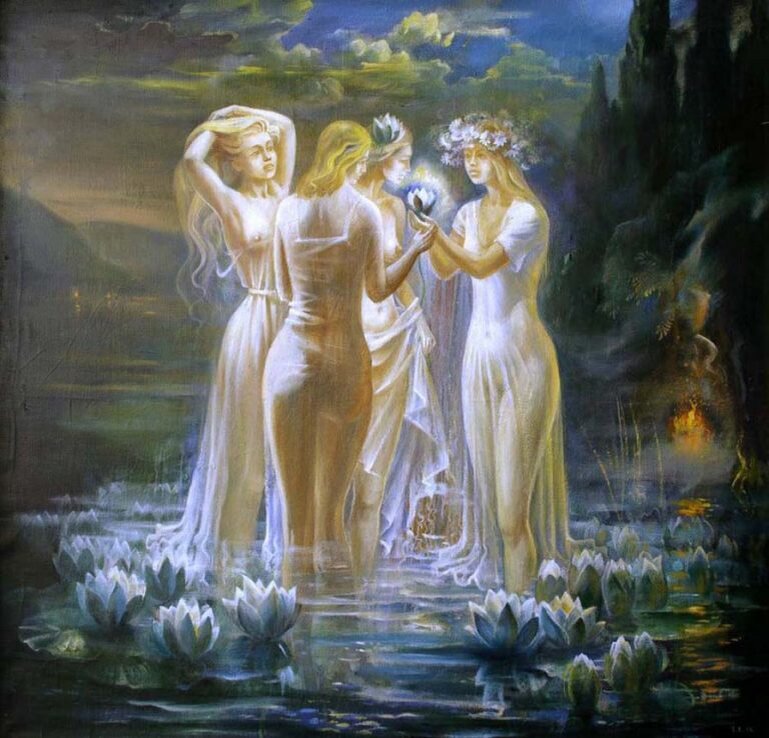В матовом облаке двигались странные прозрачные существа очень похожие на наших девушек. Длинные волосы до земли были очень светлые и отливали серебром при свете луны. Тонкие силуэты незнакомок были хрупкими и прозрачными до того, что через них были видны кусты. Белые прозрачные одеяния с широкими рукавами касались травы.