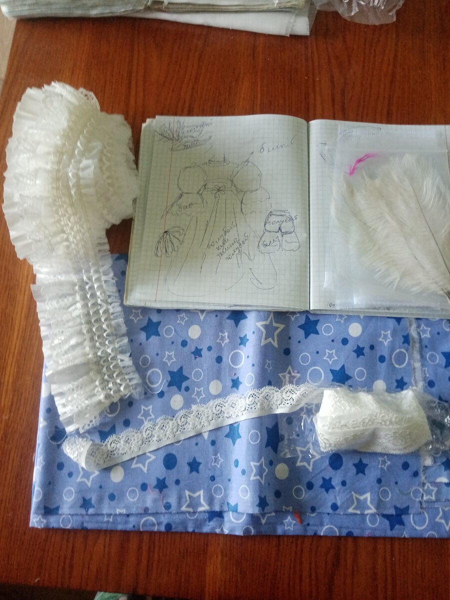 Доброго времени суток! Продолжаю одевать свою красавицу. Сегодня хочу дать выкройку платья, шляпки и ретузов. Для начала выберу ткань, кружева, аксессуары. Выкройки я делаю сразу на всё. Начну шить со шляпки на фото три детали рядом с широким рукавом, детали делаю в белом и голубом цвете, после сшивки деталей выворачиваю и украшаю Далее сшиваю ретузы И приступаю к платью. Как вы заметили там много мелких деталей, но это для того, чтобы легче было вшить рукава и кружево все детали в двойном экземпляре для лица и изнанки И оставшаяся деталь юбка я просто взяла ткань и присборила её после соединила детали В качестве застежки взяла пришивные кнопки, и наконец готовое платье со шляпкой вашему вниманию.