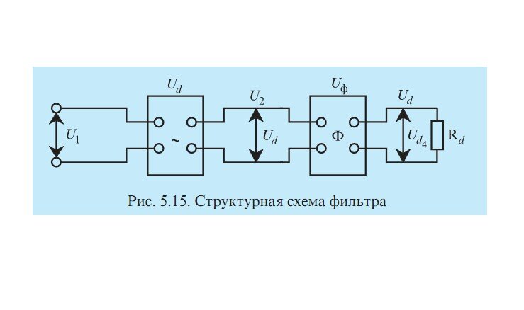 Для надёжной работы электронной аппаратуры, устройств автоматики и других потребителей выпрямленного тока необходимо ликвидировать пульсацию выпрямленного напряжения, так как повышенная пульсация создаёт дополнительные колебания, следовательно, и искажения в усилителях, ухудшает условия коммутации тока и увеличивает потери в двигателях. Поэтому на выходе всех выпрямителей устанавливают специальные устройства, называемыесглаживающими фильтрами,или реакторами (рис. 5.15). Действие фильтра по уменьшению пульсации выходного напряжения характеризуется коэффициентом пульсации Кп, который определяется как отношение амплитуды основной гармоники пульсации U~1 к постояной составляющей Ud, т.е. q = U~1 / Ud. Пульсация напряжения на нагрузке характеризуется коэффициентом q1, который определяется соотношением амплитуды основной гармоники пульсации на нагрузке и выпрямленного напряжения т.е. qi = Ud~/UdR. Отношение значений q и qi определяет степень сглаживания выпрямленного напряжения и на