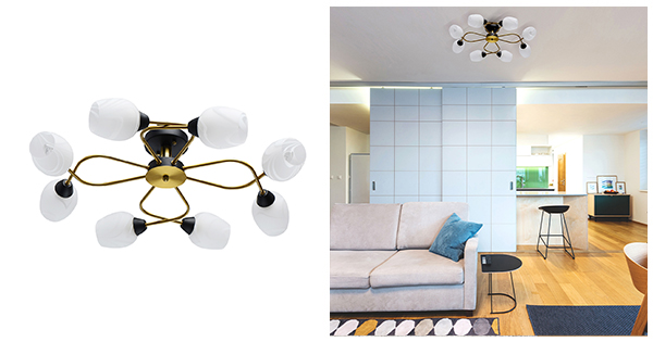 Стены? Нет, не слышали Всеобщее стремление к мобильности и универсальности, кажется, лишает нас устойчивой опоры, а именно – традиционных стен, которые медленно, но верно превращаются в «отживший материал». На смену им пришли перегородки, мобильные панели, которыми разделяют зоны, а иногда и комнаты. Например, в интерьере с люстрой Олимпия привычная и некогда очень популярная планировка – объединенная кухня-гостиная, разделенная на две отдельные комнаты с помощью раздвижной перегородки. Она непрозрачная – за счет этого достигается визуальная обособленность. Люстра Олимпия 638018608 Черные акценты Контрастный дуэт черного и белого – одно из самых простых и беспроигрышных сочетаний. Сдержанная палитра добавляет обстановке упорядоченности и элегантности. А чтобы не заскучать от монотонной классики, расставьте парочку ярких акцентов. Например, бархатные бирюзовые кресла, как в интерьере кухни с люстрой Альгеро. Люстра Альгеро 285011804 И снова белый Казалось, белый наконец уступил место яр