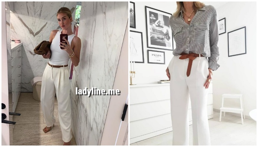 Белые брюки намного универсальней, чем вам кажется. Многие заблуждаются думая, что светлые брюки подходят только для праздничных сетов и не более. В данной публикации мы, на конкретных примерах продемонстрируем, какими многогранными и разными по стилистике могут быть аутфиты с белыми брюками. Используйте белые брюки для создания трендового монохрома. Комбинация: брюки + футболка + кожаная куртка + ботинки на тракторной подошве — идеальный и незаезженный вариант на каждый день. Ярким акцентом в данной композиции является нежно-голубая сумка в минималистичном исполнении. Рубашка в полоску + белые брюки — сочетание, пропитанное морской тематикой. В таком образе можно пойти на работу или в кафе на берег моря. Обратите внимание, как чудесно смотрятся, в одном тандеме, белые брюки с жакетом и однотонной футболкой. Ничего лишнего, в этом образе все акценты расставлены грамотно и продуманно. Брюки белого цвета с разрезами по сторонам + толстовка + жакет + кроссовки — образ, включающий в себя с