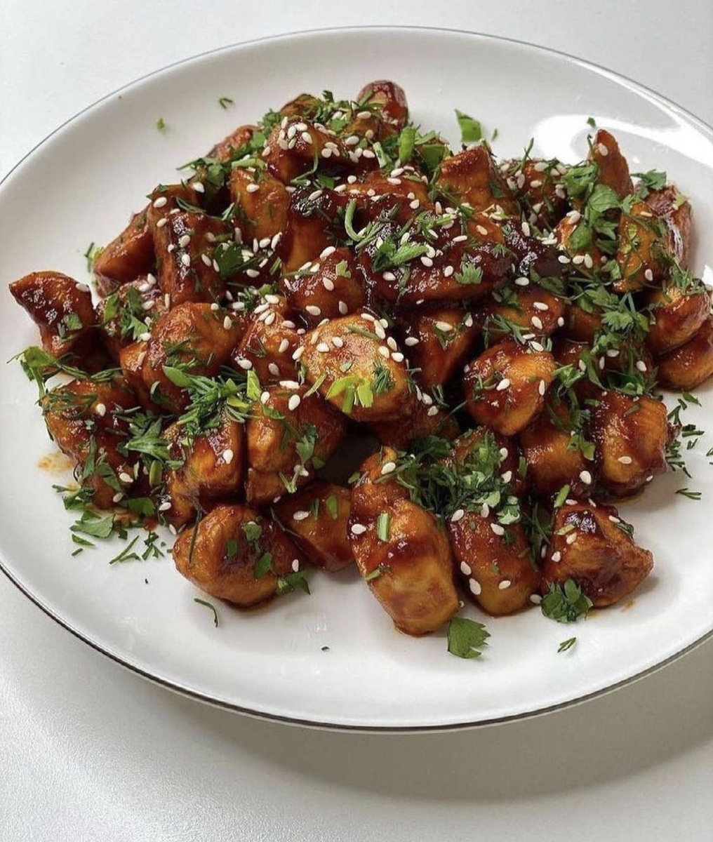 ⠀ Вкусно, просто, полезно ⠀ КБЖУ на 100 грамм - 116/20/1/6 Общий вес продукта ~ 600 г. ⠀ Ингредиенты: - Филе - 500 гр - Мёд - 1 ст.л. - Томатная паста - 1 ст.л. - Соевый соус - 2-3 ст.л. - Чеснок - 2 зубчика - Кунжут - Зелень ⠀ Приготовление: Куриное филе нарезаем кубиками. И обжариваем на растительном масле в течении 7-10 минут. Для соуса смешиваем мёд, томатную пасту, соевый соус и измельчённый чеснок. Всё хорошо перемешиваем и перекладываем соус к обжаренному филе. Тушим под крышкой в течение 5 – 7 минут. Приготовленное мясо перекладываем в тарелку посыпаем кунжутом и рубленый зеленью. ⠀ Приятного аппетита!
