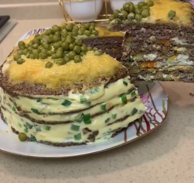 Ингредиенты: Печёнка 500г, Яйцо 3шт, Мука 3ст.л, Майонез, Лук, Морковь, Зелёный лук, Соль, Специи Способ приготовления: Чистим лук, измельчаем в блендере или промалываем в мясорубке печень и лук. К получившейся смеси добавляем яица, муку, соль, перец, специи и перемешиваем. Из получившегося теста выпекаем блинчики на раскалённой сковородке, смазанной растительным маслом. Нарезаем лук и натекаем морковь. Обжариваем. Нарезаем зелёный лук и добавляем к майонезу. Каждый блин смазываем майонезом и обжаркой. Выкладываем длины друг на друга в форме торта. Верхушку торта можно посыпать тёртым сыром. Перед подачей отправляем в холодильник на 2-3 часа. Если рецепт вам понравился подписывайтесь и пишите комментарии) С любовью.