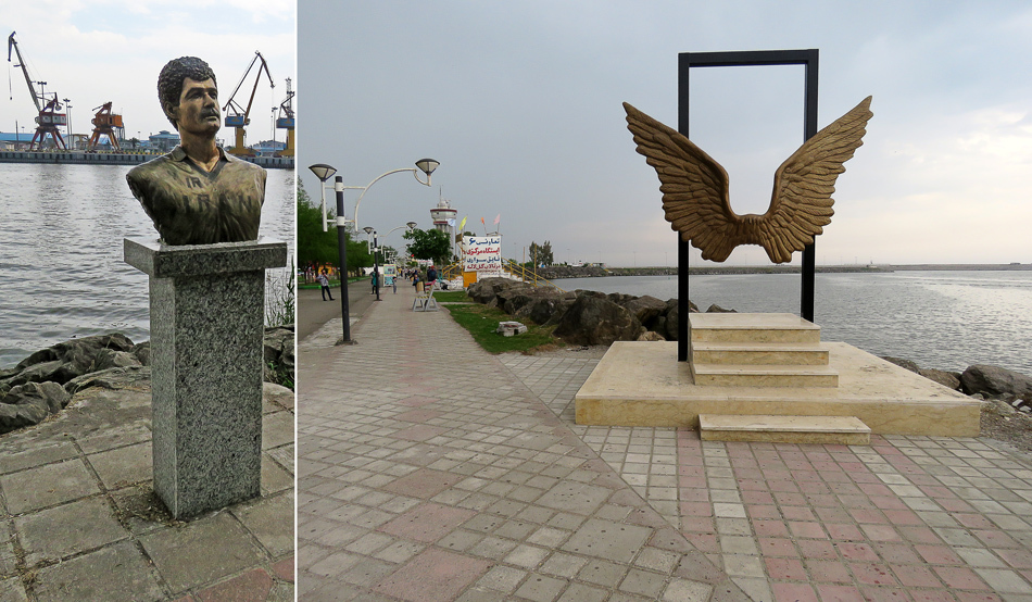 В Энзели, главном иранском порту на Каспии, набережная 700-метровой длины была обустроена в 1928 году, и видимо по аналогии с соседним Баку, называется Бульваром. Здешний бульвар конечно поскромнее, покороче да поуже, и всё-таки по нему приятно погулять. По другую её сторону - мутная вода пролива, соединяющего Энзелийскую лагуну с открытым морем, и порт на том берегу, где привычные гости - суда из России и Казахстана. Прямо напротив памятника сухогруз "Омский-138", построенный в конце 1980-х в Румынии и ныне приписанный к Таганрогу, отходил от причальной стенки, чтобы направиться в открытое море в сопровождении пары лоцманских катеров. У "нашего" же берега сновали жёлто-синие деревянные лодки, полные семейного вида персов в спасательных жилетах: За баснословные по местным меркам деньги (что-то вроде 5 евро, хотя это несколько дешевле аналогичных услуг в Калязине) на нескольких пристанях Бульвара продают лодочные экскурсии по Энзелийской лагуне. Программы их разные, самая ко