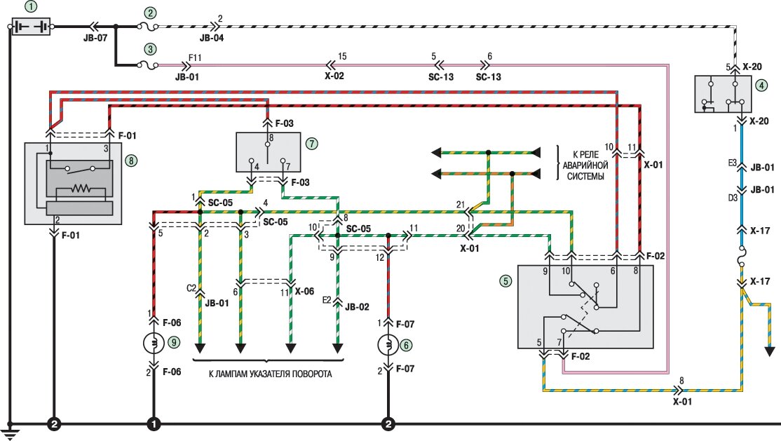 1 – аккумуляторная батарея; 2 – плавкая вставка IG2 (30 А); 3 – предохранитель HAZARD (15 A); 4 – выключатель (замок) зажигания; 5 – выключатель аварийной сигнализации; 6 – правый повторитель; 7 – выключатель указателей поворота; 8 – реле указателей поворота; 9 – левый повторитель.