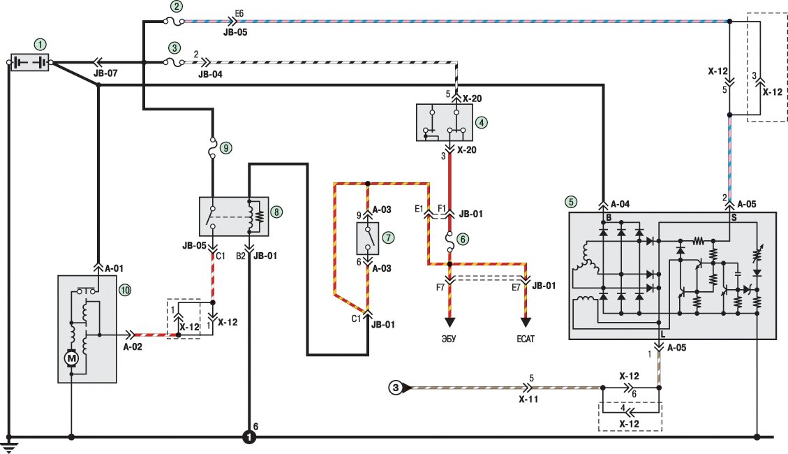 1 – аккумуляторная батарея; 2 – плавкая вставка HEAD (25 A); 3 – плавкая вставка IG2 (30 А); 4 – выключатель (замок) зажигания; 5 – генератор; 6 – предохранитель цепи стартера (10 А); 7 – выключатель блокировки стартера (только на автомобилях с автоматической коробкой передач); 8 – реле стартера; 9 – предохранитель стартера (20 А); 10 – стартер