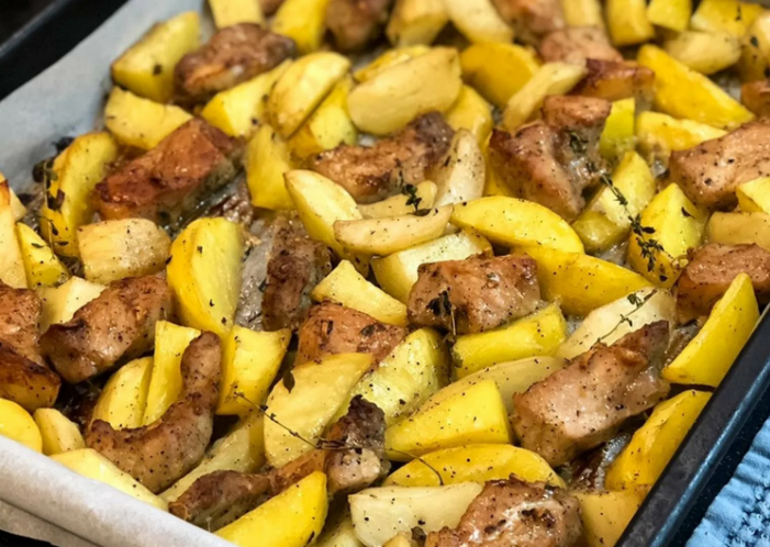 Еще один способ запекания мяса с картошкой в духовке. Свинина с картофелем и луком — ароматное и сытное блюдо, приготовьте его в выходные. Ингредиенты Приготовление Шаг 1 - Свинину нарезать не мелко, посолить и поперчить. Шаг 2 - Обвалять мясо в муке и обжарить на подсолнечном масле до румяной корочки. Шаг 3 - Картофель почистить и нарезать крупными ломтиками. Посыпать паприкой и куркумой, перемешать. Шаг 4 - Картофель также слегка обжарить в разогретом масле. Шаг 5 - В форму для запекания выложить мясо, сверху выложить картофель и посолить. Нарезать крупно лук и произвольно разложить его между картофелем. Шаг 6 - Залить картофель с мясом сливками. Сливки подойдут любые жидкие. Шаг 7 - Запекать в духовке при 180 градусах 35-40 минут. Готовую румяную картошечку с мясом можно подавать сразу. Приятного аппетита!