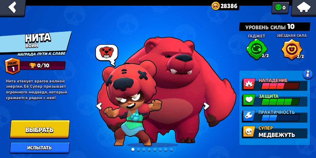 Следующий боец это Нита это боец- награда на пути к Славе за 10 кубков Вот так выглядит боец Нита На этого бойца есть много скинов и сейчас я их всех покажу. Этот скин называется "панда Нита" его можно купить за 30 кристаллов в магазине. Этот скин называется "нита красный нос" он стоит 150 кристаллов, и это новогодний скин. Этот скин называется "сиба ину нита" он стоит 150 кристаллов. Этот скин называется "коала нита" он стоит 80 кристаллов в магазине. Этот скин называется "серебряная нита" его можно купить за 10.000 золота когда на бойце 10 сила. Это скин называется "золотая нита" его можно купить после серебряного скина за 25.000 золота. Этот скин называется "морская нита" он стоит 80 кристаллов в магазине. На этом скины кончаются, но сейчас я покажу значки на Ниту Это значки на Ниту, а также гаджеты Первый гаджет Второй гаджет Первая звездная сила Вторая звездная сила Ну а на этом я заканчиваю свой рассказ Всем до завтра