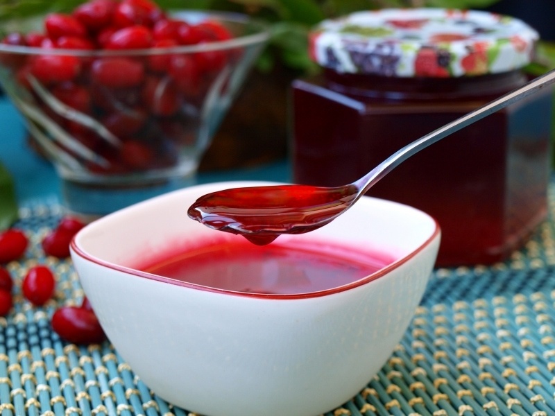 Способ приготовления: Желе можно приготовить как из садового кизила, так и из дикорастущего. Чистые ягоды помещают в эмалированную посуду. Заливают небольшим количеством воды так, чтобы они были ею покрыты. Ставят на огонь и варят до тех пор, пока не лопнет кожура на всех ягодах и не вытечет сок (его процеживают). На 1 л. сока кладут 900 г. - 1 кг. сахара, все ставят на огонь и кипятят, пока не выкипит 1/3 содержимого, добавляют один стакан сока из айвы или яблок и варят до готовности. Горячее желе разливают по банкам, после охлаждения закрывают бумагой и завязывают.