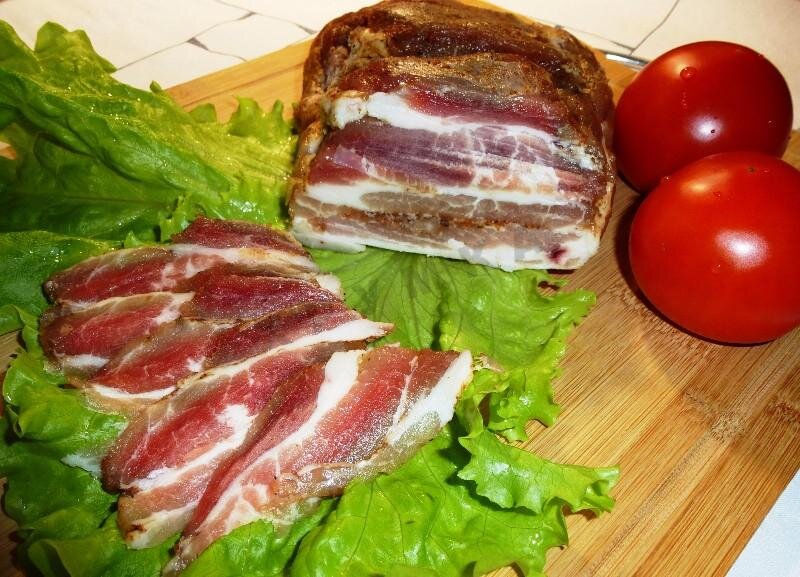 Ингредиенты: Способ приготовления: 1. Наливаем в кастрюлю 2 л воды. Добавляем соль , перец , лавровый лист. Ждем пока закипит и добавляем грудку , варим на маленьком огне 40 минут. Оставляем в прохладном месте настаиваться двое суток. 2. Через два дня достаем грудку и обсушиваем бумажным полотенцем. 3. Смешиваем аджику с чесноком и тщательно натираем грудинку со всех сторон . 4 Убираем грудинку в целлофановый пакет , неплотно завязываем и оставляем на 2-3 часа при комнатной температуре . Затем убираем в морозильник или подаем к столу .