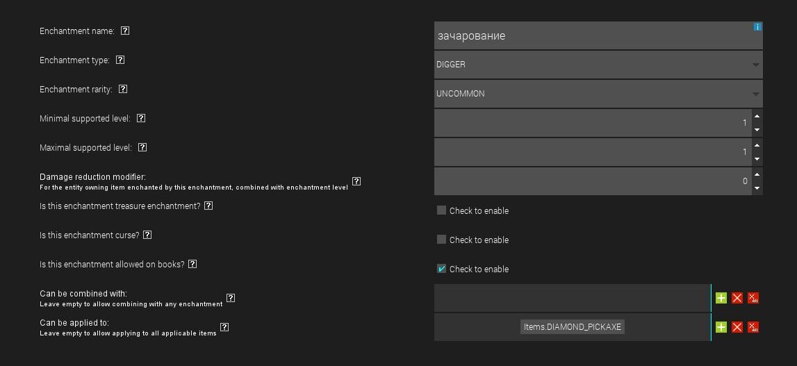 Доброго времени суток! Вот уже и 10 Гайд по созданию модов. ЗАЧАРОВАНИЕ мы сделаем зачарование 3x3x3 Давайте начнём с зачарования. Плюсик - enchantment Enchantment type - тип зачарование у меня это зачарование на кирку.
