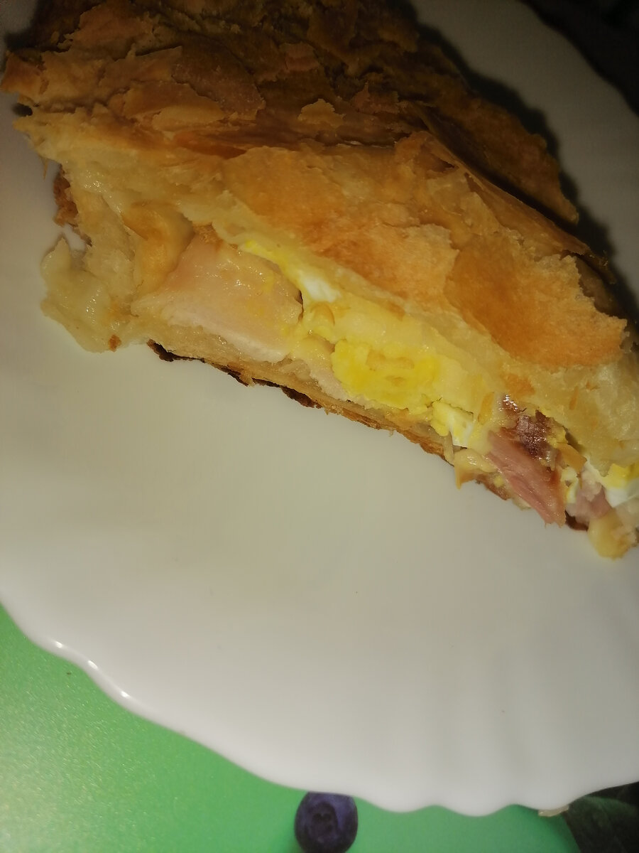 Необычно вкусное сочетание продуктов в этом пироге делает из него просто бомбу. Готовится быстро и несложно. Ингредиенты : слоёное тесто - 1 упаковка, копчёная курица - 500 гр, яйца куриные - 3 шт., сыр Гауда - 250 гр. 1. Подготавливаем начинку для пирога. Сыр натираем на крупной тёрке. Копченое мясо нарезаем пластинками. Яйца отвариваем, чистим и нарезаем кубиками. 2. Первый пласт теста раскатываем, укладываем на противень смазанный маслом и укладываем начинку слоями (половина сыра - мясо - яйца - вторая половина сыра) немного оставляя края теста незаполненными. 3. Раскатываем второй пласт теста, накрываем сверху и защипываем. 4. Выпекаем при температуре 200 гр 20-25 минут.