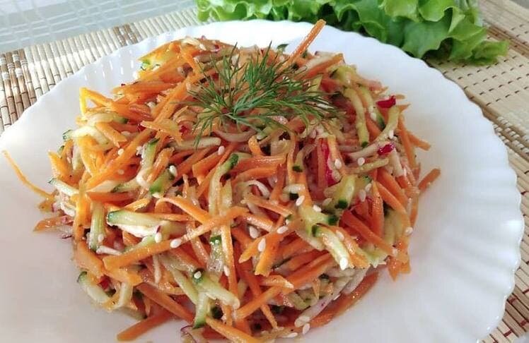 В сочетании со свежим огурцом и редисом салат из моркови получается вкусный, с лёгкой остринкой. А рецепт очень простой.