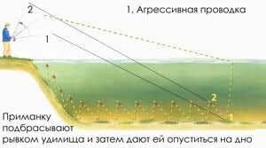 После погружения на дно с помощью быстрых, почти похожих на подсечку, подъемов удилища приманка подбрасывается вверх, в средние слои воды. Тем самым имитируются движения быстро убегающей рыбки, которая, колеблясь, снова опускается на дно.