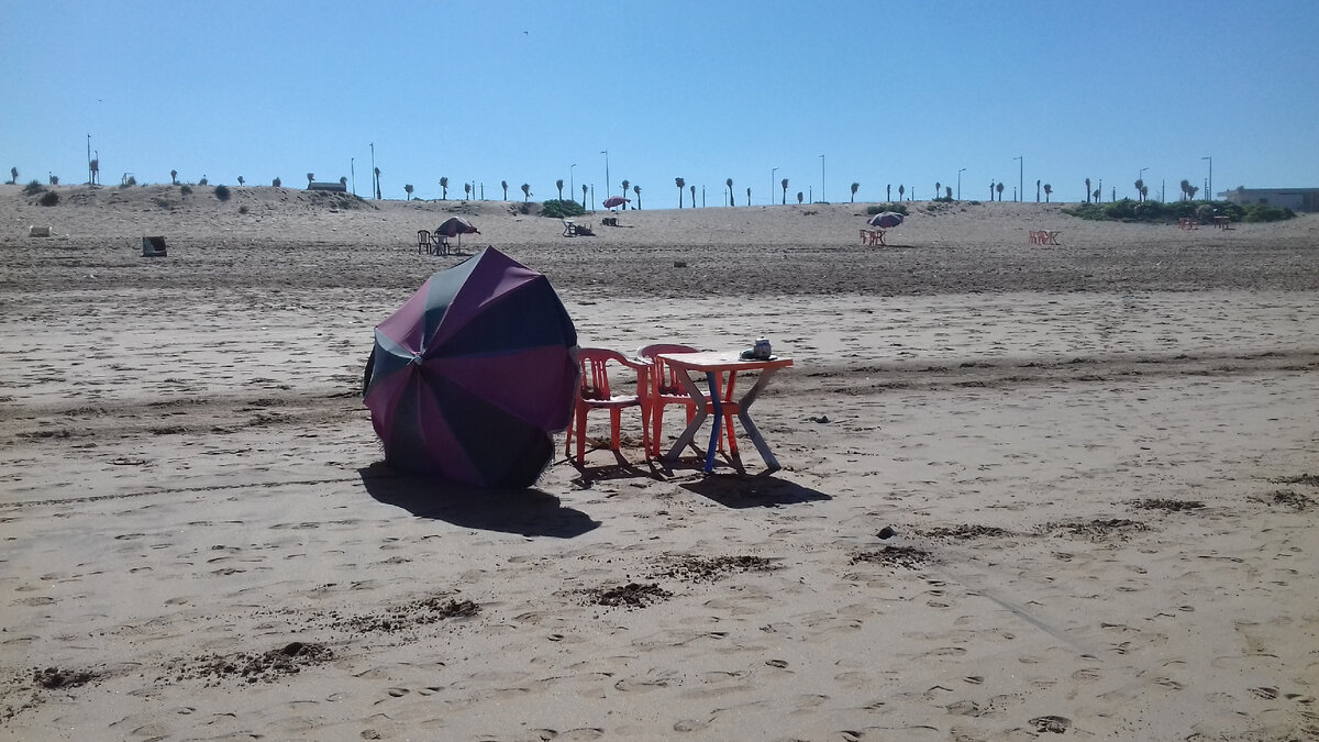 Статья 5. Продолжение статей 1-4 о поездке на Атлантику в Марокко. На следующий день мы, отдохнувшие и выспавшиеся, двинулись в сторону океанского побережья, захватив с собой немного провизии (лёгкий обед) и мою тёплую куртку (подстилка для посиделок). Решили устроить хорошую прогулку вдоль берега. Берег в большей степени каменистый, а устроенные пляжи - в основном с завозным песком. Местное население (мужчины) - традиционно, на песке, у кромки воды - босиком играют в футбол. Улетевший в океан мячик им быстренько возвращает прибрежная волна. Солнышко пригревает неплохо, так, что через пару дней у нас были обгоревшие лица. Но мы в свитерах, потому что с океана дует прохладный ветерок, ведь его температура 16 градусов. По всей длине центральных песчаных пляжей расположились мини чайные со столиками и стульчиками под зонтиками. Местный чай нас не привлекает и мы по камням удаляемся в океан для перерыва на обед. Выбрав камень поудобнее, располагаемся на нём, подстелив куртку. Здорово! Мы