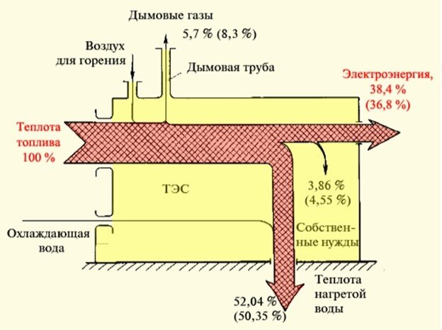 Основная потеря тепла на ТЭС возникает из-за передачи теплоты конденсации охлаждающей воде, которая затем отдает ее окружающей среде. С теплом охлаждающей воды теряется более 50 % тепла, поступающего на ТЭС с топливом. Кроме того, в результате происходит тепловое загрязнение окружающей среды.
