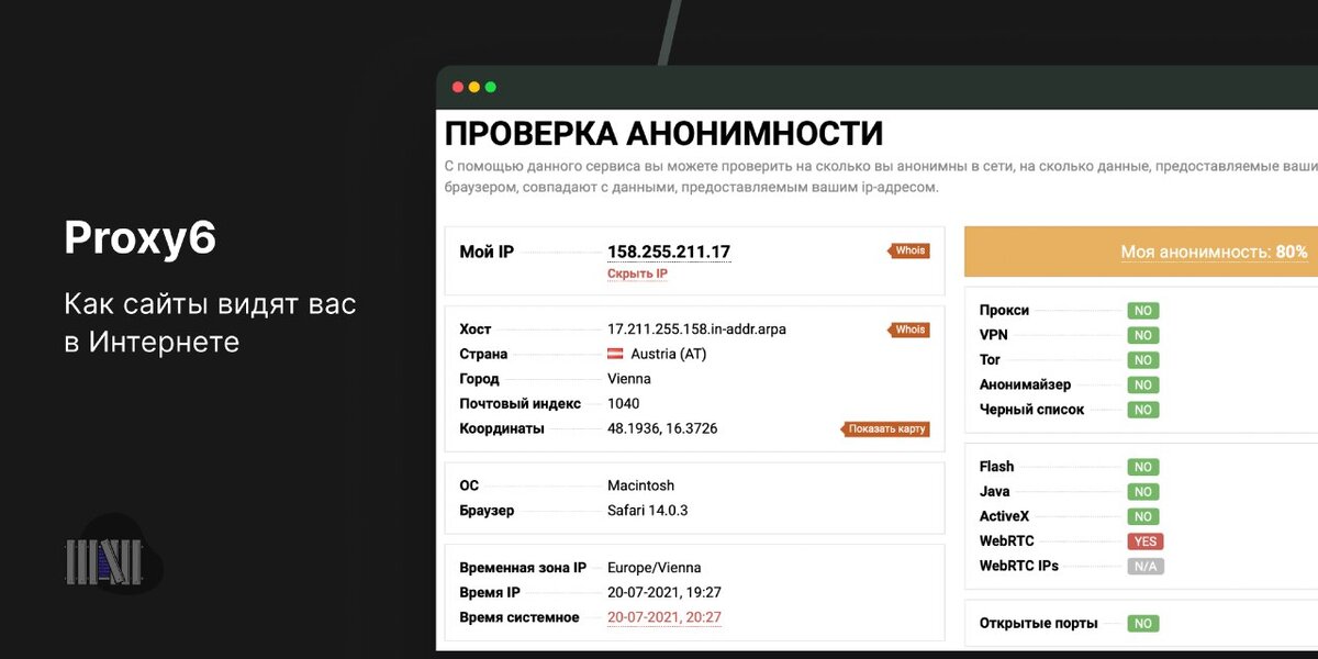 Все сайты, которые вы посещаете, видят ваш адрес, IP и название провайдера. Но если вы заботитесь о своей анонимности, то наверняка используете VPN или Tor, чтобы сайты не узнали ваши настоящие данные. Иногда они сбоят: например, VPN или прокси перестают работать — и показывают ваш реальный IP. Чтобы обезопасить себя от этого, используйте сервис Proxy6. Он собирает и проверяет все ваши данные, а через несколько секунд показывает результаты проверки. Вы узнаете, как выглядит ваш условный профиль в Интернете — включён ли VPN, прокси, Tor, режим Turbo и двусторонний пинг. А также Proxy6 проверит вас в базах утечек: например, слит ли ваш DNS, IP-адрес через WebRTC и другие данные. P.S: Друзья! Если вы посчитали эту информацию полезной и она вам понравилось, то не забудьте поставить лайк. А если вы не хотите пропустить еще больше полезной инфы, то нажмите на подписку. Тебе интересно, мне приятно)
