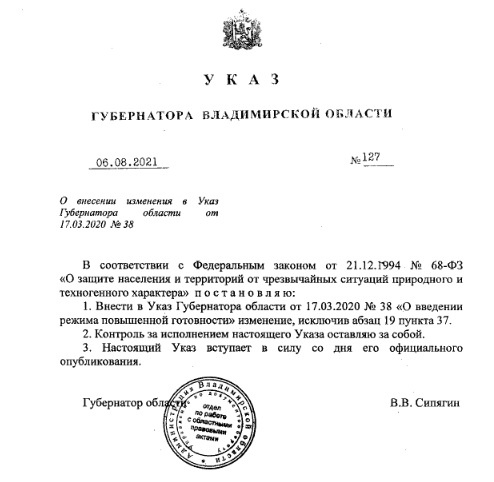 Ограничения, действовавшие с 15-го июля, отменил глава региона Во Владимирской области с 6-го августа, когда были официально опубликованы изменения в Указ губернатора №38 от 17-го марта 2020-го года «О введении режима повышенной готовности», ослаблены ограничения для гостиниц и прочих мест временного пребывания. Теперь их деятельность ограничивается только рекомендациями Роспотребнадзора. Ограничения для гостиничного бизнеса во Владимрской области были введены с 15-го июля. Согласно им туристов можно было заселять только с отрицательным ПЦР-тестом, со сроком годности не более 3-х дней, либо со справкой о вакцинации от коронавируса.
