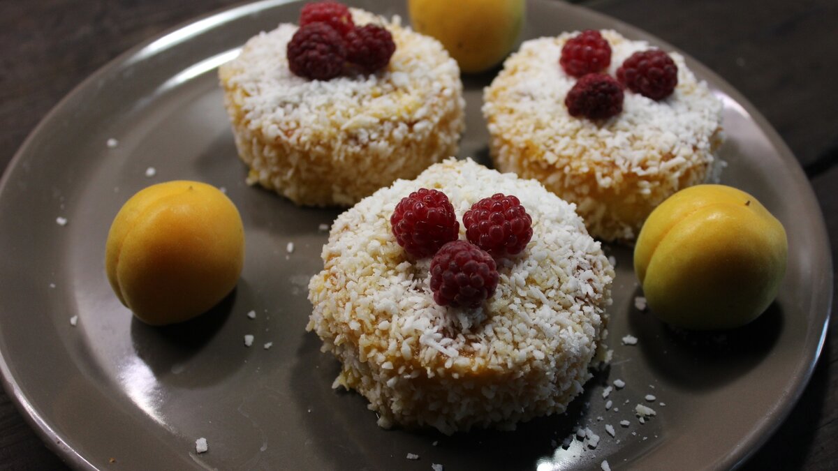 Приготовим пирожное из абрикосов в кокосовой стружке . Пирожное получается влажным. Не сухим. С ярко выраженным вкусом абрикоса. С кокосовой стружкой и малиной. Очень вкусно! Ингредиенты 250 гр муки 250 гр сахара 200 гр абрикосов 150 гр йогурта абрикосового 100 гр слив. масла 50 гр растительного масла 30 гр кукурузного крахмала 3 яйца + 1 желток 12 гр разрыхлителя 10 гр ванилина Абрикосовый джем. Кокосовая стружка . Отделяем белки от желтков и взбиваем в стойкую пену В желтки добавляем сахар и взбиваем до бела Смешиваем белки и желтки осторожно перемешиваем и добавим абрикосы Выливаем смесь в форму для запекания .На дно формы кладём или бумагу для выпечки или коврик Ставим в разогретую духовку 180 градусов на 30 мин. Смотрите по своей духовке Затем надо его остудить. Я положила в пакет и в морозилку на 20 минут. Вырезаем формочкой пирожные Сделаем абрикосовое пюре. Перебиваем абрикосы блендером с сахаром и варим 5 минут остужаем. на 200 гр абрикосов 50 гр сахара Смазываем пи