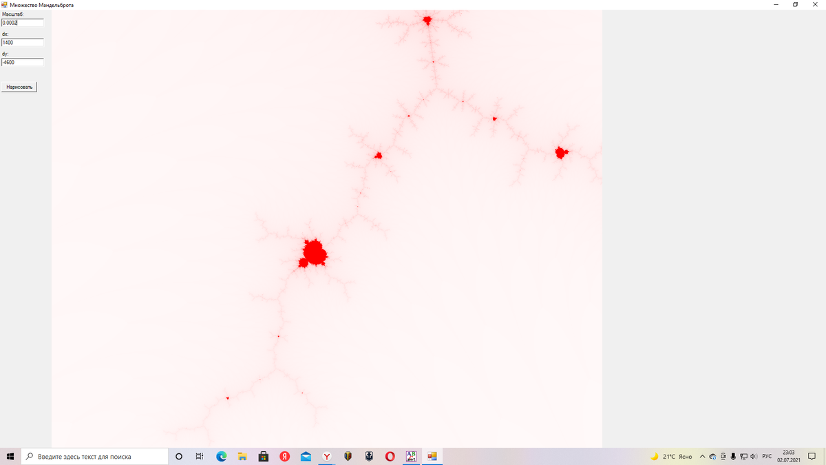Множество Мандельброта является одним из самых известных фракталов, в том числе за пределами математики, благодаря своим цветным визуализациям. Его фрагменты не строго подобны исходному множеству, но при многократном увеличении определённые части всё больше похожи друг на друга. Точное значение площади множества Мандельброта неизвестно. На 2012 год она оценивалась как 1,506 591 884 9 ± 2,8×10−9. Точная координата центр масс (расположенного на оси абсцисс) тоже неизвестна и оценивается как −0,286 768 420 48 ± 3,35×10−9.Ткже есть программа на паскале. uses System.Drawing, System.Windows.Forms, System.Threading, FormsABC; procedure DrawMandelbrot(g: Graphics; w,h: integer; scale: real; dx,dy: integer); const max = 10; begin for var ix:=0 to w-1 do for var iy:=0 to h-1 do begin var x := 0.0; var y := 0.0; var cx := scale * (ix - dx); var cy := scale * (iy - dy); var i := 1; while i<255 do begin var x1 := x*x-y*y+cx; var y1 := 2*x*y+c