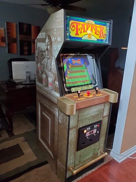 Так вот, тема видеоигр мне весьма близка, я и задумался ведь наверняка и раньше бренды делали что-то для продвижения бренда, разные игры по брендам Mars и Ferrero я видел, а вот по пиву нет. И вот, один известный канал по играм недавно вскользь упомянул о такой игре! Игра называется Tapper выпущена она была в 1983 году. Суть игры заключалась в том, чтобы обслуживать посетителей и наливать им вовремя пиво. Игрок управляет барменом, у которого есть несколько стоек и в конце каждой стойки свой кран, посетители движутся вдоль неё, бармен должен вовремя забирать пустой бокал, наливать новый и содержать стойку в чистоте. Если же посетитель добирается до конца одной из стоек - игра окончена и бармена вышвыривают под шум толпы, также игра заканчивается если бармен разбивает бокал. Если же игрок справился и обслужил всех посетителей, то начинается бонусный уровень, где злодей в маске трясёт банки, а затем их меняет местами, игроку надо угадать, где банка, которую не трясли. На каждом уровне мож