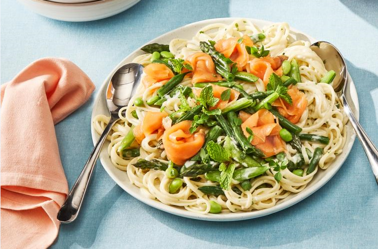В большой кастрюле с кипящей подсоленной водой варите лингвини 10 минут или до состояния al dente, добавьте спаржу, фасоль и замороженый горошек в течение последних 3 минут времени приготовления и эдамаме в течение последней минуты. Хорошо слейте воду. Тем временем в большой кастрюле растопите масло на среднем огне. Добавьте лук и чеснок; варите, помешивая 3 минуты. Вмешайте муку. Постепенно влейте в молоко и, часто помешивая, доведите до однородной массы около 5 минут, пока смесь не закипит и не загустеет. Добавьте соль и перец. Добавьте пасту, помешивая, пока она не станет горячей. Добавьте лосось и мяту. Выдавите сок из лимона в макароны и перемешайте.