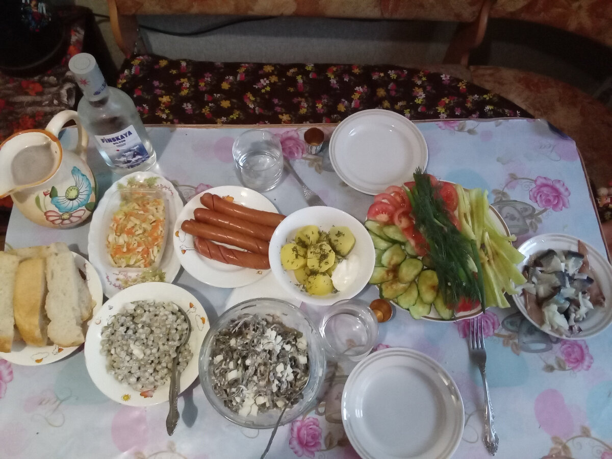 В один прекрасный вечер после трудового дня, мы захотели чего-то странно необычного. Решили посидеть отдохнуть в ретро стиле. Отварили картофель, посыпали укропчиком, погрели сосиски, нарезали селедочку с луком, сделали овощную нарезку, салат из морской капусты с яйцом, салат из горошка с луком и салат из свежей капусты с морковью, порезали хлебушек. Сделали морсик:) Удачно посидели, отдохнули и расслабились. Спасибо за то, что читаете мои статьи!!!