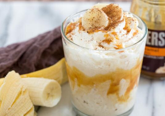 Перелить коктейль в высокий стакан, украсить по своему вкусу и сразу же подавать. Для украшения используйте вареную сгущенку, листья мяты и шоколадную конфету. У вас получится вкусный напиток с легким карамельным вкусом.