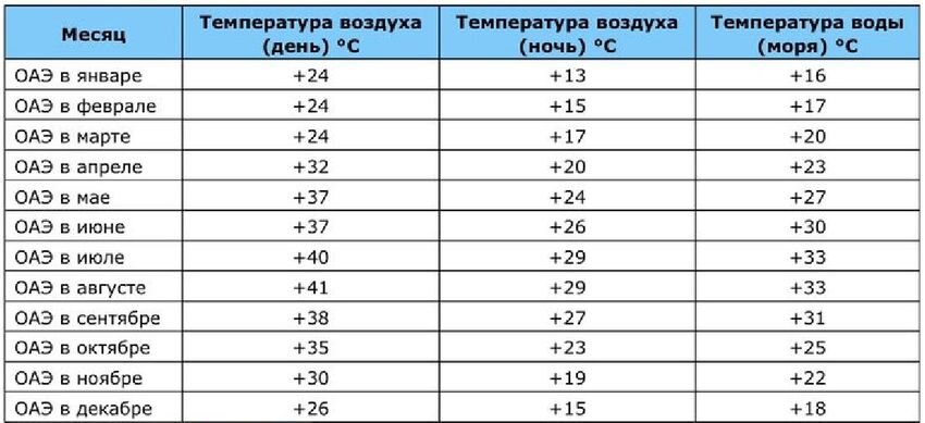 Температура воздуха в среднем больше +30°, вода в Персидском заливе прогревается до +27°. Гости ОАЭ называют такую тёплую и солнечную погоду идеальной и с радостью приезжают в Арабские Эмираты осенью или весной.