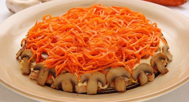 - Выкладываем на блюдо салат в форме купола. Смазываем купол слоем майонеза. Украшаем отложенными обжаренными пластинками шампиньонов, укропом, корейской морковью.