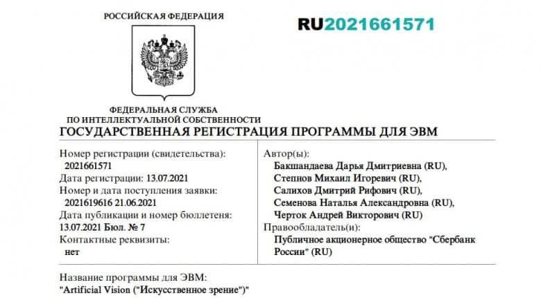 «Сбер» зарегистрировал компьютерную программу, созданную с использованием искусственного интеллекта (ИИ). Разработкой ПО Artificial Vision («Искусственное зрение») занималась команда Sber AI. В качестве авторов в патенте указаны разработчики «Сбера», которые изначально обучили нейросеть, написавшую программный код на C++ и Java для Artificial Vision. Зарегистрированная в Роспатенте версия программы Artificial Vision имитирует зрительную функцию человеческого организма — занимается распознаванием визуальных образов. Она предназначена для сопоставления пикселей изображения нейронам «сетчатки» искусственного глаза и может применяться для создания модели искусственного интеллекта, способной существовать в виртуальной среде и учиться восприятию визуальных сцен. Данное ПО является частью программного комплекса компании, разработанного в рамках научного поиска и создания универсального ИИ. Это направление компания считает приоритетным и старается его развивать в настоящее время. Разработчи