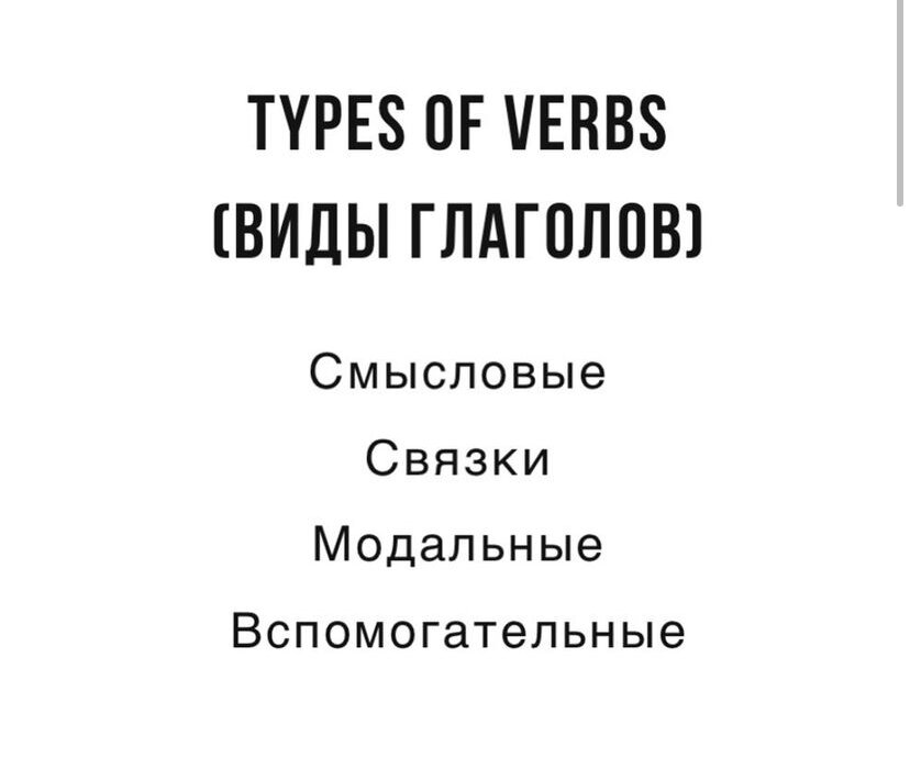 Глаголы (Verbs) 💯 Тема глаголов очень важна и интересна в любом языке, давайте разберемся, какую роль она играет в изучении английского языка 🇬🇧 Все глаголы можно разделить на: 🌷Смысловые (notional verbs) - самостоятельные глаголы, имеющие собственное лексическое значение (She is READing) 🌷Связки (link verbs) - почти утратившие собственное значение, нужны для связи подлежащего и второстепенных членов предложения (He IS my friend) 🌷Модальные (modal verbs) - не существуют без смыслового глагола, придают ему оттенок модальности, отношения говорящего к действию (Jack CAN help us) 🌷Вспомогательные глаголы (auxiliary verbs) - выражают лицо, число и время, помогают образовать видовременные формы и грамматические конструкции, но не имеют своего лексического значения (WILL you go with me?) 💥Важно помнить, что некоторые глаголы могут относиться сразу к нескольким группам ☺️ Сегодня поговорим о самом популярном глаголе в английском языке - “to be”, который можно перевести как «быть, нах
