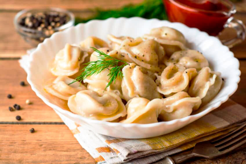 Пельмени напоминают итальянские равиоли, но больше по размеру. Начинка классических пельменей производится из говядины, свинины и / или баранины с добавлением различных специй, лука. Есть также несколько экзотических рецептов с участием медведя, оленины, лося, гуся, рыбы и сала. Многие хозяйки, особенно в деревнях и небольших городах, готовят пельмени дома. Зимой пельмени готовят в больших количествах, в процессе участвует вся семья. Затем пельмени замораживают, а затем используют по мере необходимости в течение долгих зимних месяцев.Пельмени подают со сметаной, маслом или с соусом из воды и уксуса; или их можно есть в бульоне. Уха - русское национальное блюдо, разновидность супа из разных сортов рыбы, приготовленная оригинальным способом. Селедка - главный ингредиент популярного в России салата «селкдка под шубой». Салат очень оригинальный. Однако многим итальянцам он нравится за уникальность вкусовых сочетаний. Традиционно его готовят к новогоднему празднику. Блины в России это блюдо