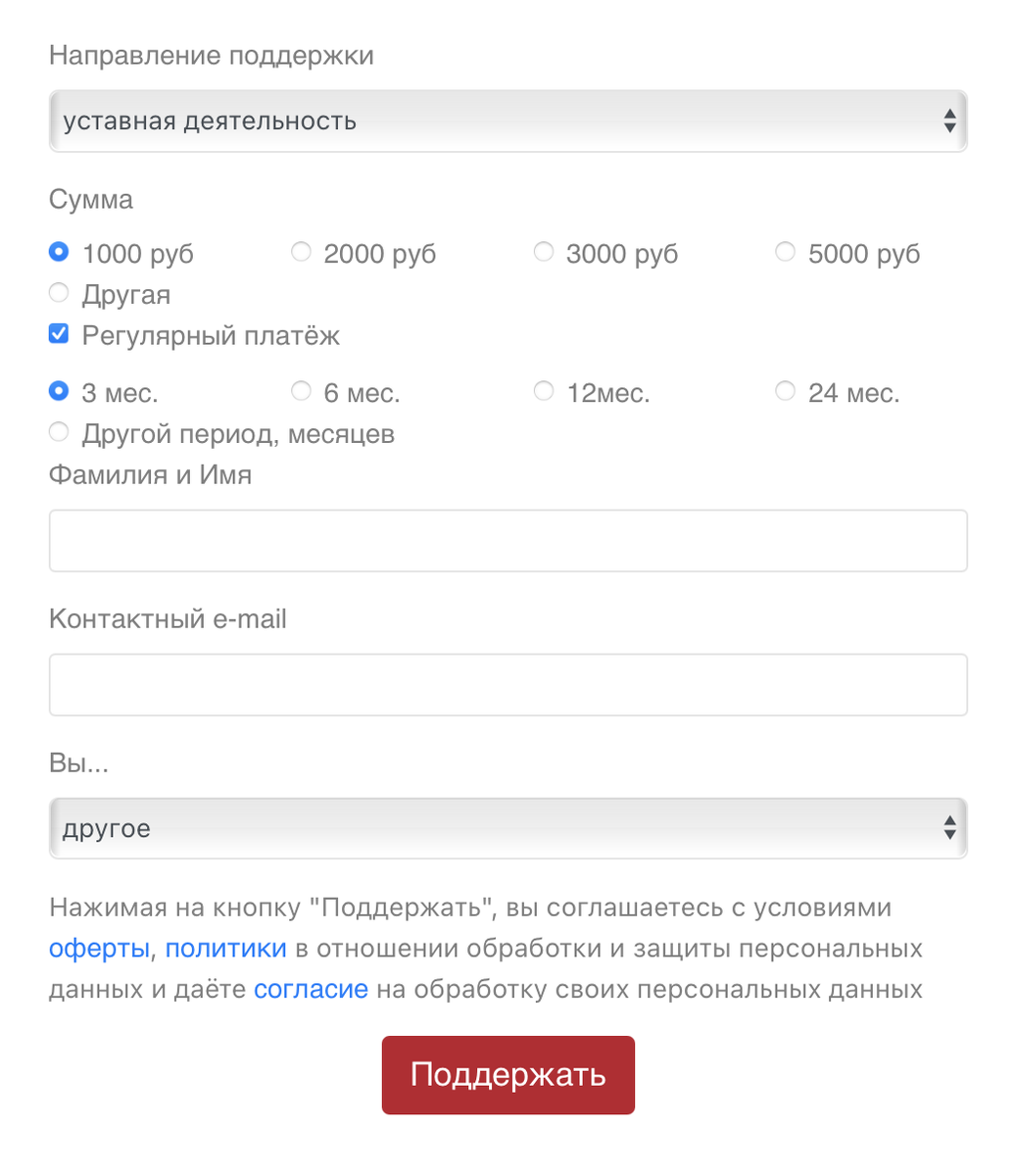 К нам обратилась компания – благотворительный фонд. С задачей подключить форму оплаты на сайте, для приёма взносов через платёжную систему CloudPayments. Сайт компании работает на CMS Tilda. Требования, которые необходимо учитывать в заполнении формы на поддержку (оплату): В заполняемой форме указываются эти данные, сумма взноса и возможность установить рекуррентный платеж. В разделе рекуррентного платежа указывается сумма и период для автоматического списания средств с карты. Данные о жертвователях попадают в CRM Битрикс24 c созданием: В момент, когда заполнена форма на перечисление пожертвования и пользователь нажимает кнопку «Поддержать», создаётся сделка в статусе Заполнена платёжная форма. В момент, когда платеж принят, то есть Поступили денежные средства, устанавливается статус Оплата поступила успешно. Если по какой-либо причине в процессе оплаты платёжная система возвращает статус Отказ, сделка переводится в статус Отказ платёжного шлюза, с указанием причины отказа. Все эти дан
