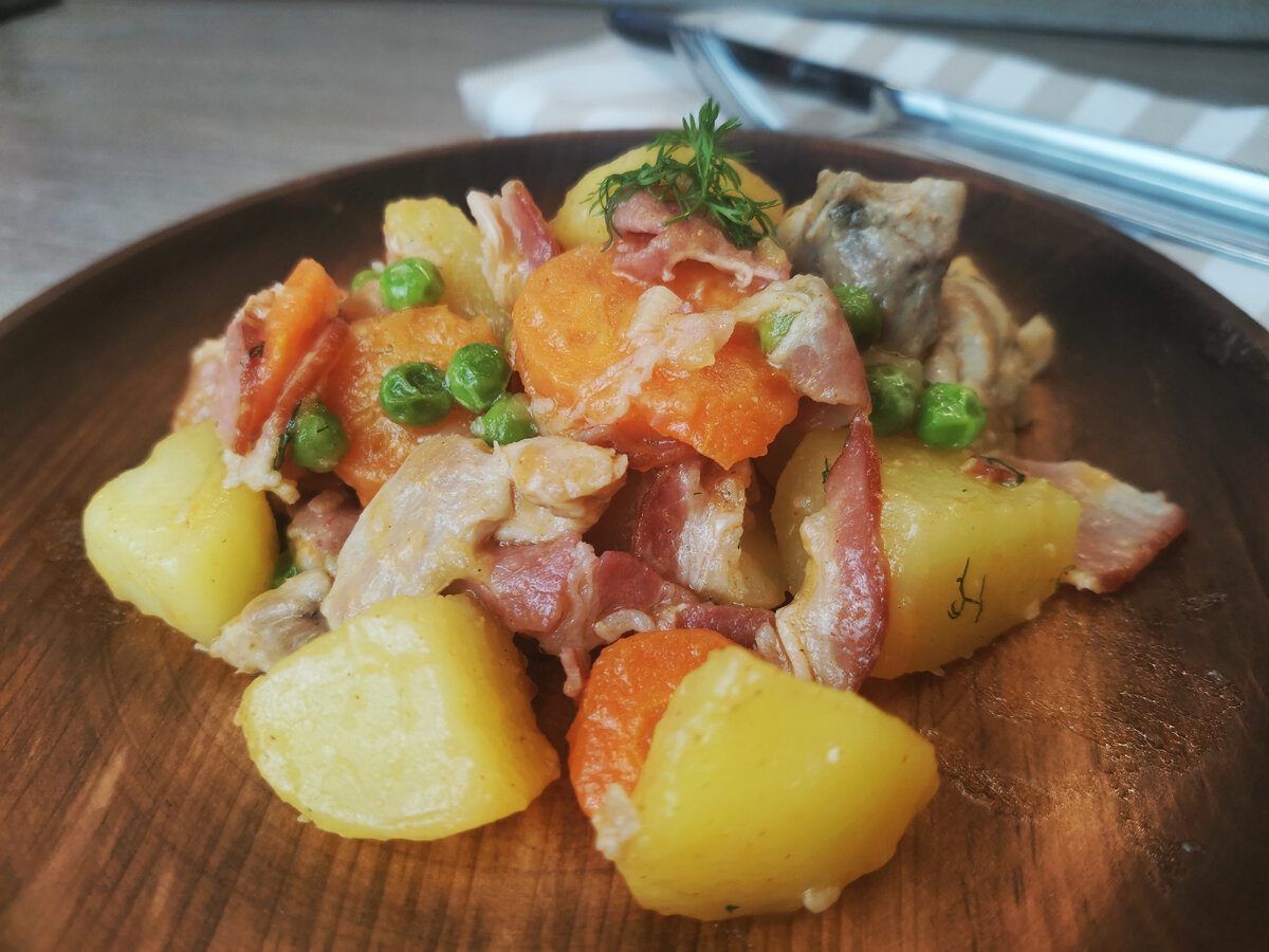 Рагу с курой, картофелем, беконом и горошком, настоятельно рекомендуем