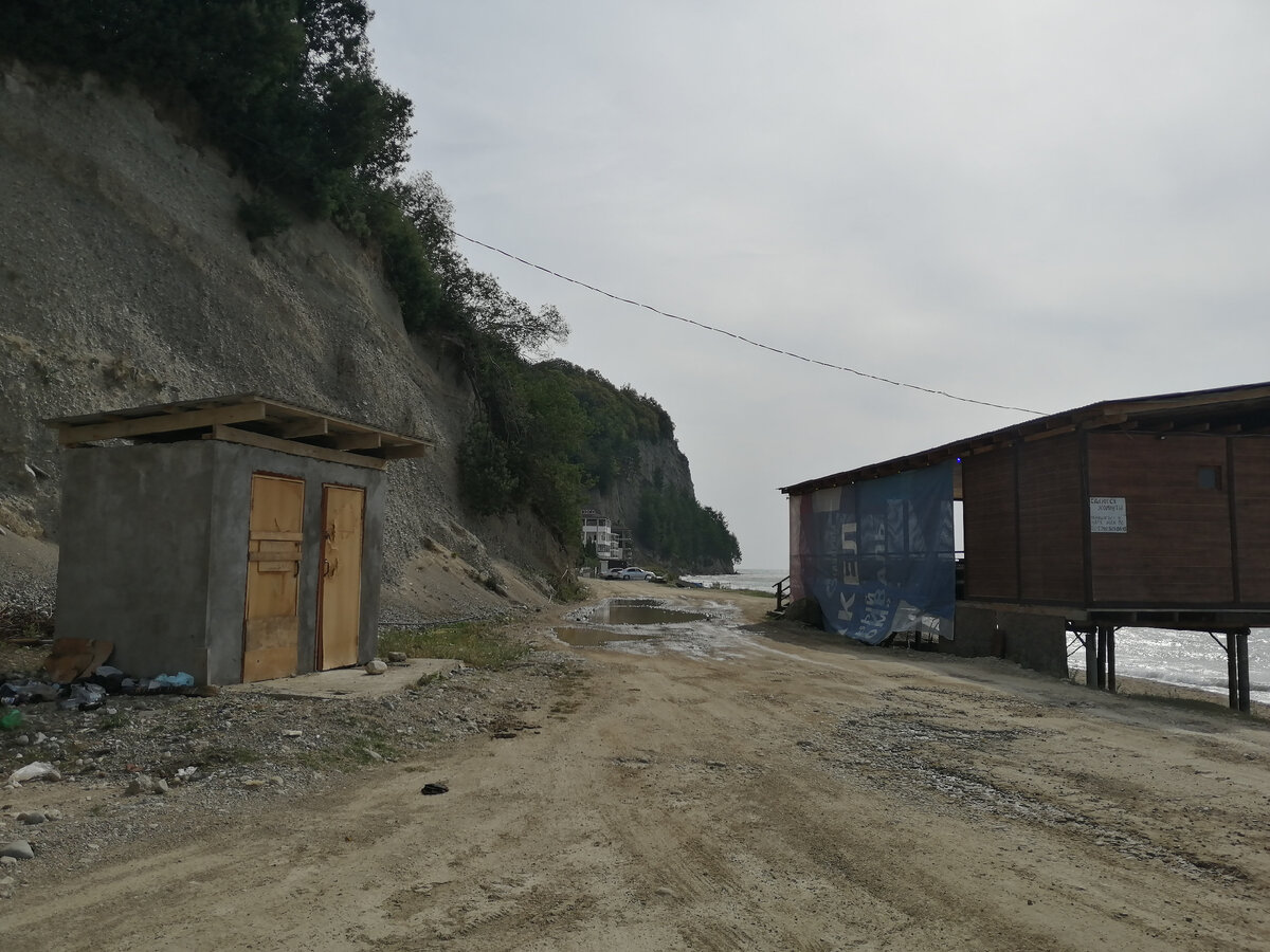 Мне было интересно, есть ли там жизнь (хотя, было очевидно, что есть) и я пошла. Вот по такой дороге между морем и горой (можно по пляжу). А это типа столовая. Так что можно перекусить, если будет работать в этом году.
