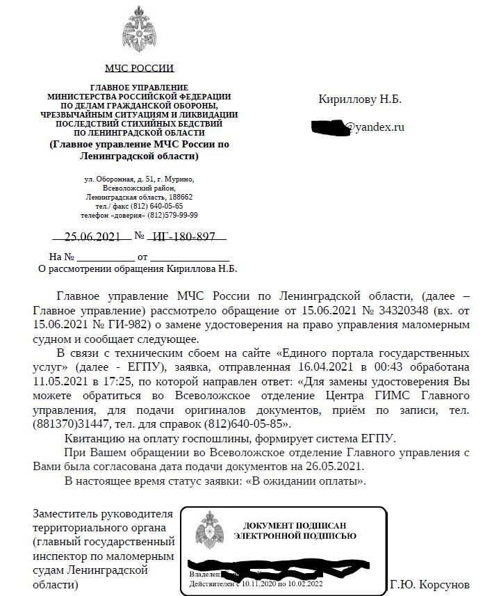 Кстати, документ я в конечном итоге поменял, и услугу получил. И ГИМС Санкт-Петербурга , где и произошло получение услуги, счет на оплату выставил прямо в день обращения.А областной ГИМС отписывается , что не работал портал Госуслуг, валя с больной головы на здоровую.