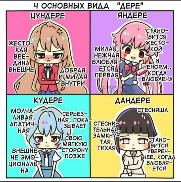 Для упрощения и разделения такого многообразия девушек в аниме - придуманы архитипы и здесь я поведаю о них. Уверен , что даже в 1ой части вы найдете для себя что-то новое , а во 2 и 3 вряд ли хоть что-то заранее знали.(всего выделяют 14 типов "дере") P.s. Да я знаю , что некоторые дере относят к парням , но все же термины в основе для девушек Яндере - изначально очень нежный и любящий персонаж, влюблённость которого по каким-либо причинам становится одержимостью, чаще всего приводящей к насилию. Термин происходит от слов «яндэру» ( «психическое расстройство») и «дэрэдэрэ» (, «нежный, любящий»). В то время как персонаж янгирэ в большинстве случаев является отрицательным или трагическим персонажем, яндэрэ могут выступать в качестве главного романтического интереса героя произведения, а их агрессия использоваться в качестве особой «изюминки» произведения. Как пример аниме " Дневник будущего" . И Юно Гасай как представитель яндере Цундере -японское слово, служащее для описания персонаж