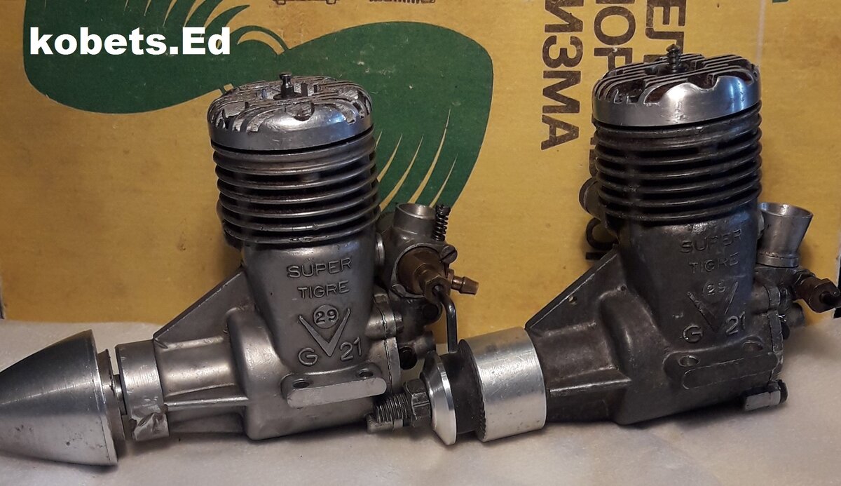 Приветствую!! Продолжаю рассказывать о микродвигателях итальянской фирмы "Микромеханика Сатурно", и сейчас обзор двс Супер Тигр G 21/29. Двс G 21/29 был разработан в 1965 г , а в 1966 г начался серийный выпуск этих микродвигателей. Первоначально был разработан двс с распределением рабочей смеси коленчатым валом. Позже на его базе были разработаны варианты двс с золотниковым распределением , радио варианты и варианты двс с рубашкой водяного охлаждения. В 1969 г был выпущен скоростной двс Ж 21/29 с цветной парой , рассчитанный на работу с резонансной трубой. Двигатели выпускались только в калильном варианте.л Микродвигатели Ж 21/29 с распределением рабочей смеси дисковым золотником, изготовленным из пластмассы. Представлен радио вариант двс и вариант для кордовых пилотажных моделей. Калильный двс с золотниковым распределением Ж 21/29 имеет рабочий объём 4,82 кб.см.. Ход поршня 17 мм. Диаметр поршня 19 мм. Продувка поперечная . Пара "чёрная ". Масса двс-- 265- 280 гр. Оборот