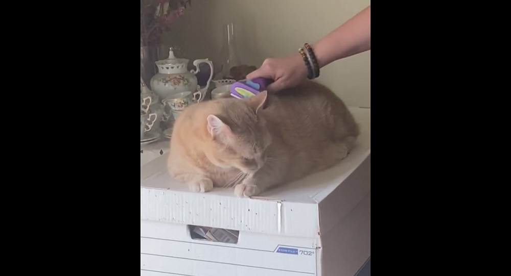 Толстый рыжий кот расположился с комфортом на коробке. Хозяйка, воспользовавшись моментом, решила вычесать его шерсть. Во время процедуры животное вело себя смирно. Закончив чесать кота, девушка сняла со щетки комок шерсти, который упал перед мордой кота. Принюхавшись, он понял, что красоту навели вопреки его желания. Животное осталось недовольно такой бесцеремонностью. Вначале кот шипит на комок шерсти, затем, увидев хозяйку, переключается на нее. Кажется, ещё мгновение и он бросится на девушку. На этом видео прерывается. Вряд ли когда девушка осмелится ещё раз причесать питомца без спроса. Причесывать кошек полезно. Это поможет сохранить их здоровье, а также избавит жилище от лишней шерсти. Но не все животные спокойно переносят данную процедуру, некоторые активно сопротивляются. Приучать нужно животное к расчёсыванию с раннего возраста, тогда оно спокойнее будет переносить манипуляции. Сократить время на уход за шерстью поможет качественный фурминатор, именно так называется специаль