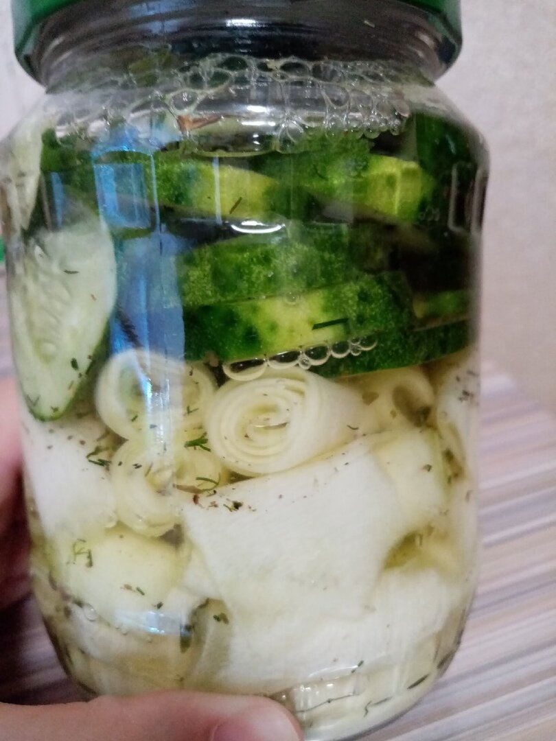 Если любите что-то хрустящее и маринованное, то этот рецептик вам точно понравится. Порезать слайсами кабачок и закрутить рулетиками, заполнить банку. Я добавила еще туда огурчики колечками. Добавлять зелень и чеснок (я мелко порезала) в банку. Приготовить маринад. На 1 литр кипятка 2 столовые ложки соли + 1 столовая ложка сахара, лавровый лист, перец душистый горошком. Остудить до комнатной температуры и залить в банку с кабачками. Добавить 1 чайную ложку уксуса 70%. Закрыть крышкой и поставить в холодильник. Через 12 часов можно лакомиться. Приятного аппетита!