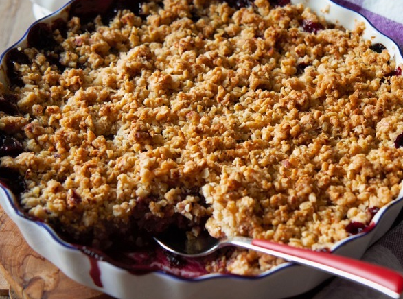 Выложить ягодную смесь на посуду. Сверху покрошить выпеченной посыпкой. Выпекать в духовке при 170 град 15 мин.