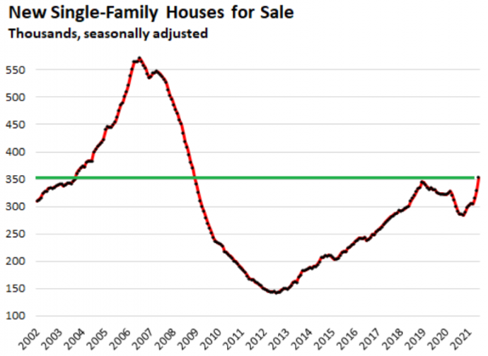 Статья используемая в очередном обзоре: Концепция продажи новых домов по завышенной цене сталкивается с проблемами. Продажи новых частных домов в США в июне упали на 6,6% по сравнению с маем и на 32% с пикового значения в январе до 676000 домов с поправкой на сезонные колебания в год, что является самым низким показателем с июня 2018 года, согласно данным Бюро переписи населения сегодня утром. Этот многомесячный спад вернул продажи домов до уровня, предшествующего пандемии. А учитывая строительный бум квартир и кондоминиумов в городских центрах за последнее десятилетие, продажи односемейных домов остаются лишь частью бума с 2002 по 2007 год (первый график статьи). Цены упали и развернули рост последних нескольких месяцев. Средняя цена проданных новых частных домов упала на 5,0% в июне по сравнению с маем, до 361 000 долларов, самого низкого уровня с марта, тем самым частично ослабив грандиозный скачок, который произошел летом прошлого года. В апреле средняя цена выросла на 22% по сравн