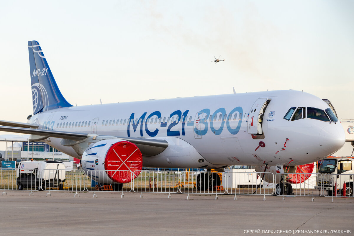 На статике МАКС-2021 демонстрировался МС-21 с бортовым номером 73054 - третий лётный прототип, выпущенный в 2019 году. Сейчас это единственный МС-21, оснащённый демонстрационным салоном.