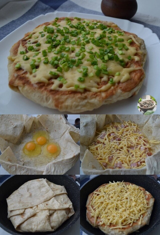 Ингредиенты: 1. Лаваш "Армянский" - 1 штука 2. Яйцо - 3 штуки 3. Колбаса, (свиная вырезка, ветчина, сосиски) - 120-150 грамм 4. Сыр - 100 грамм 5. Лук зеленый по вкусу Приготовление: Сковороду смазываем растительным маслом.